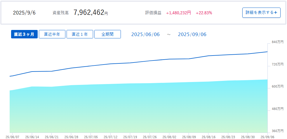 含み損益は+749276円→764190円となりました。 25000円程のプラスでした。