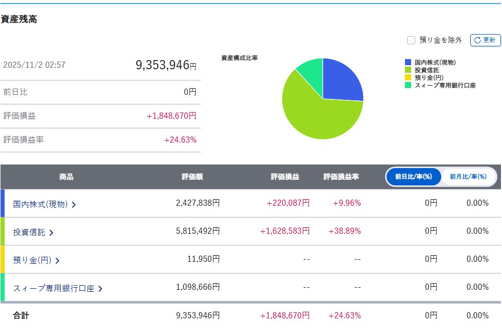 | SBI・iシェアーズ・日経225インデックス・ファンド | 472,238.45円 | +114,720.62円 | +32.09% | — |