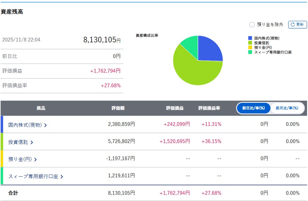 | SBI・V・S&P500インデックス・ファンド | 658,719.81円 | +325,452.41円 | +97.66% | — |