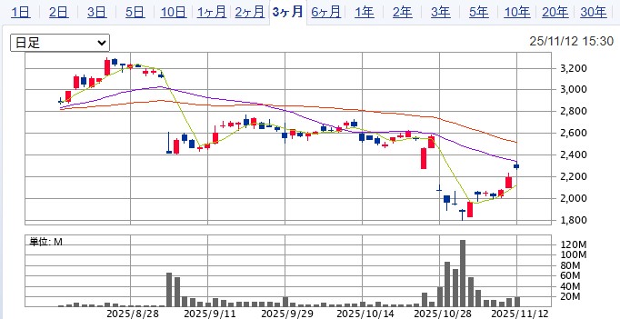 その後11月14日引け後に決算発表があり、週末のPTSで1900円台に暴落してます。欲をかかず予定通り窓埋めで売却できてホッとしました。