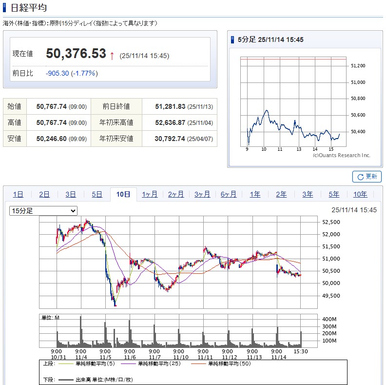 トランプ関税緩和や高市早苗相場も一段落し、半導体銘柄の高騰もNVIDIAの決算暴落やキオクシアがストップ安になる等で一服。日経平均もここから高値更新はしばらく時間掛かりそうなのと、そもそも日経平均が上がってもバリュー高配当銘柄主体の自分の持株は上がらないし、そろそろ年末の事も考えなければならないのでポジションを大幅に減らしました。