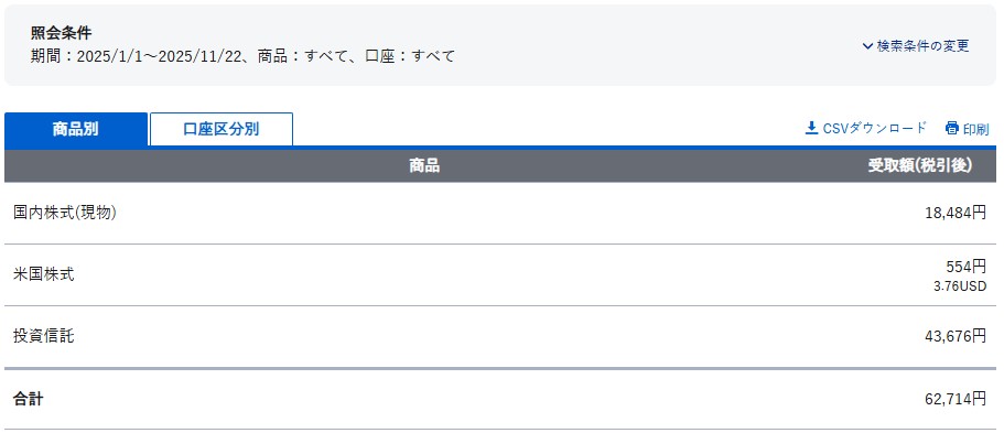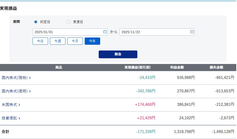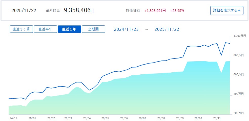 トランプ関税暴落の時に特定口座で購入した投資信託、SBI・S・米国高配当株式ファンド(年4回決算型)を少しずつ利確し始めました。予定では年末までにじっくりと、20営業日程かけて全て売却する予定です。本当は現状高値圏にあるので一気に利確したいところですが、投資信託は約定までにラグがあり、そのタイミングでアメリカが下落していたら平気で1~2%程度思っていた価格より安く売ってしまう事になりかねないので、じっくりコツコツと売却を進めていきます。こちらの資金は来年復活するNISA枠に充てる予定です。