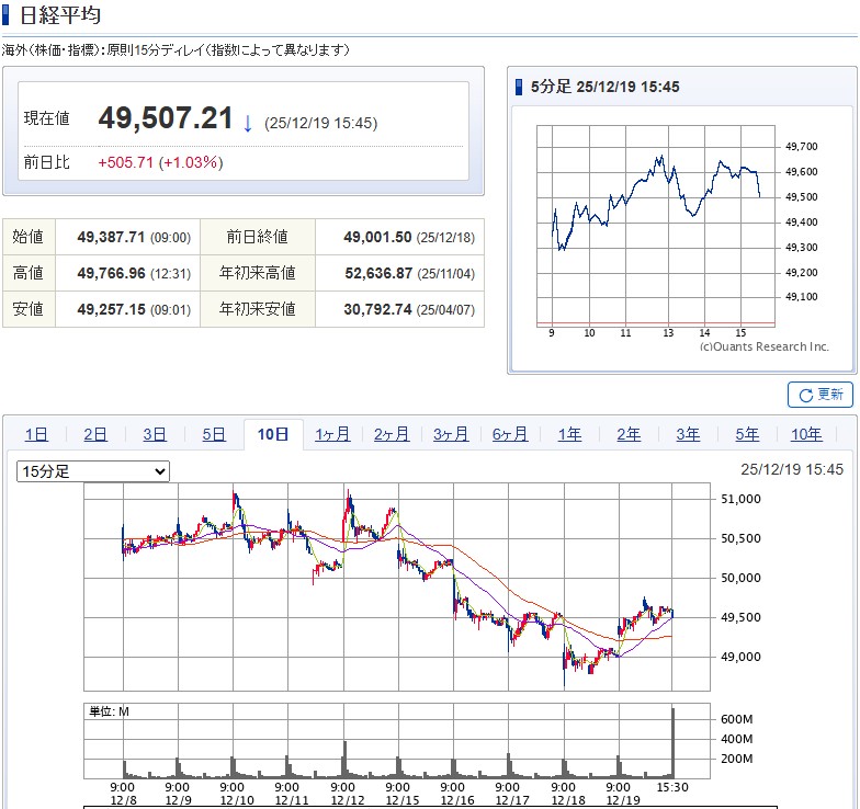 今週(12/15~12/19)は、日銀の金融政策決定会合が最大の焦点でした。日銀は政策金利を0.75%へ引き上げましたが、週初は警戒感から日経平均が5万円を割り込む場面もありました。
