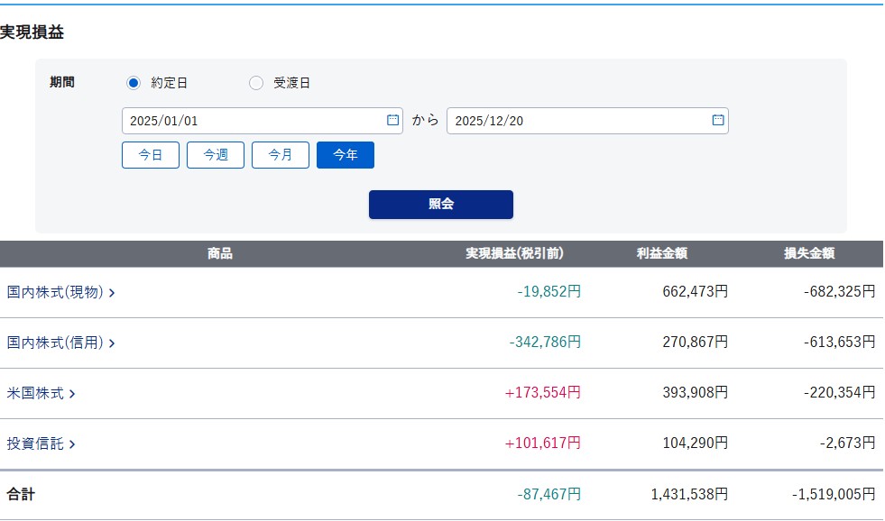 遂に実現損益と配当&分配金を合わせた2025年の収益がプラスになりました。目標としていた4月損切分56万円を何とか挽回できてホッとしてます。