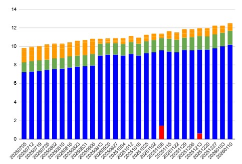 SNSでも同じ感覚の人が増えて板。AIバブル、半導体バブル、関税バブル、高市バブル。近いうちに暴落がくると予想している人が多く、キャッシュポジション多めで買い時を待てという意見が増えてきた。自分も11月~12月終盤までは同じ考えだった。