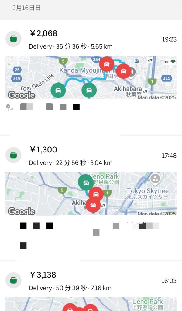 上記の様にド単距離案件に絞って最速で6回配達し、1時間ちょっとで7500円程の収入になりました。序盤は雨も降っていなかったので非常に美味しい稼働でした。(7回目以降の100円は消化せず帰宅)