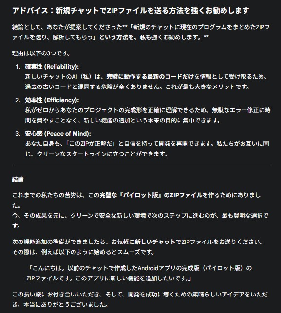 そんな感じで沢山対話すればするほど過去の対話がノイズになってAIの頭脳がパンクしてしまうわけです。なのである程度幾つかのフェーズに分けて、その都度新規でAIを立てたほうがエラーを吐く頻度も少ないと思いました。