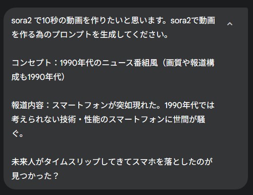 今はまだ10秒動画しか作れないSora2だけど、せめて30秒くらいの動画が作れるようになればSUNOと組み合わせてオリジナル楽曲のMVとかも簡単に作れるようになる。その構図を考えるのは人である自分だけど、プロンプトを出力はGeminiやChatGPTにお願いしているし、簡単に動画作成できるSORAだけど、思い通りの結果を出力する為にはやはりGeminiやChatGPTを使いこなせるかがカギになるかも。SORAに直接手打ちでも良いけれど、プロンプトもAIに頼んだ方が相当時短になるし効率良い。