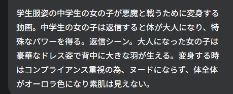 他にも女子中学生が大人の天使のヒーローみたいに変身する動画も無理だった。コンプラ的に返信がポルノ系に引っかかってる感じだったので、下記の内容を追記した。