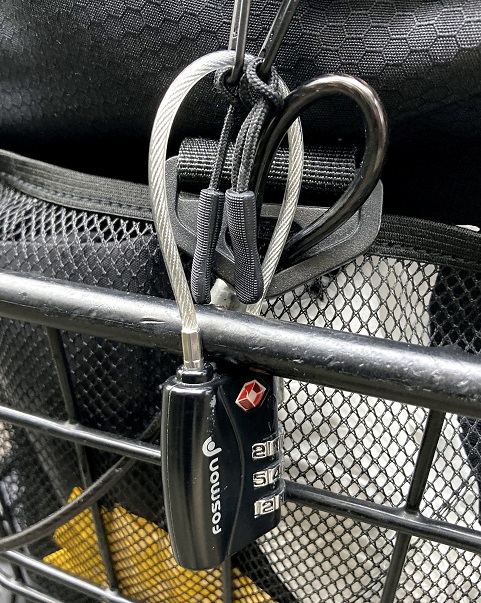 カゴにリングワイヤーと南京錠で固定。南京錠もワイヤータイプにし、同時にファスナーリングに通す事で丸ごと盗難されるの防止と、中身だけ盗難の防止を1施錠で両立。