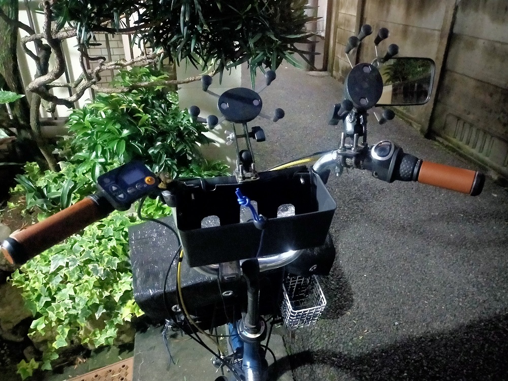 ハンドルに小物入れやミラーも増設してます。