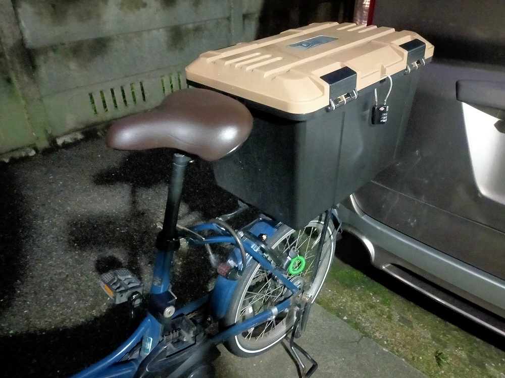 20インチを選んだのは鍵付きリアボックスを付けるため。備品の収納量は重要。リアボックスの高さとサドルの高さを合わせることによって、ウーバーバックを背負いながらリアボックスに据え置くことができる。バッグをリアに設置してしまうと段差などで飯がバウンドしてしまうので破損に繋がる。平地走行時は肩ベルトは支える程度、段差を登るときだけ肩を少し上げたり、立ち漕ぎ状態にすることでバッグを浮かし飯への振動を防ぐ。